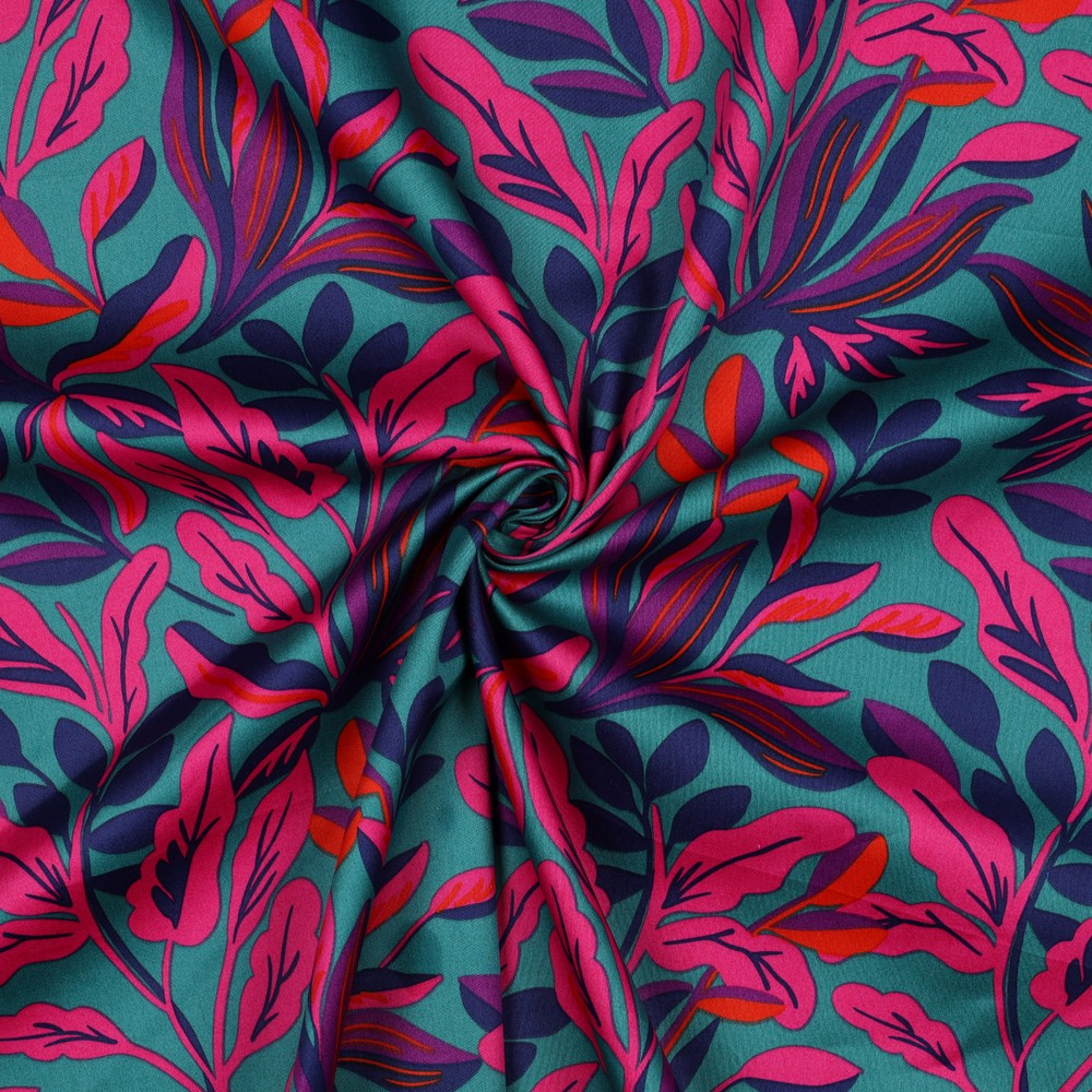 VT0277 100% Cotton 60" W Sateen Pink, purple, navy, red digital print leaves on a petrol background. Soft hand, opaque and light weight. Tops, dresses, skirts