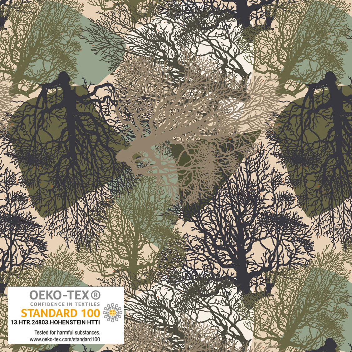 ST007 95% Cotton, 5% Elastane 60" W Jersey Trees in different taupe, charcoal, dark army green on mint, ecru and white background with small bits of scattered orange leaves. Soft hand, opaque and light weight. Tops, dresses, skirts.