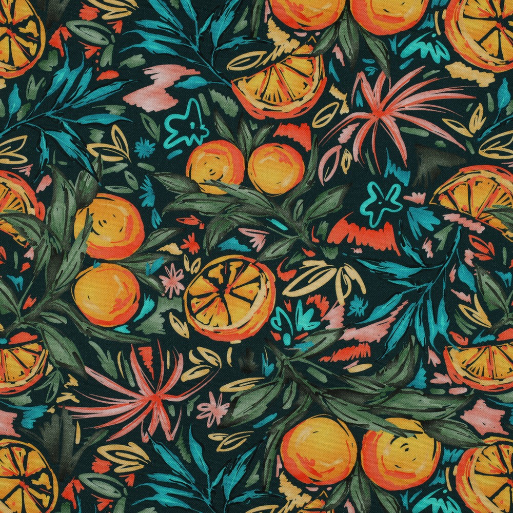 VT0321 100% Cotton 58" W Canvas Oranges digital print on green. Crisp hand, opaque. Light weight Tops, dresses, skirts, jackets, aprons. pillow covers.