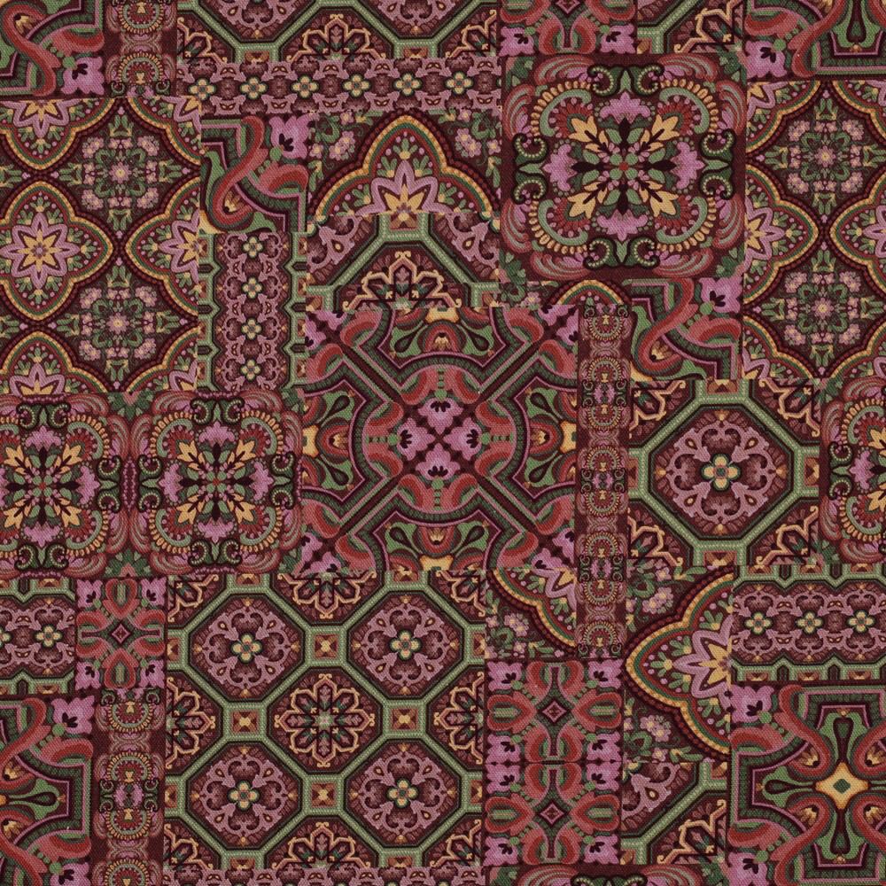 VT0322 100% Cotton 58" W Canvas Pink, green copper, burgundy, cream mosaic digital print. Crisp hand, opaque. Light weight Tops, dresses, skirts, jackets, pillow covers