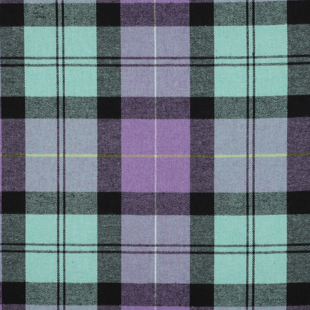 VT0203 65% Polyester 35% Cotton 60" W Yarn Dye Brushed Light turquoise, lilac and grey plaid Soft hand, opaque and light weight. Tops, dresses, skirts, shirts