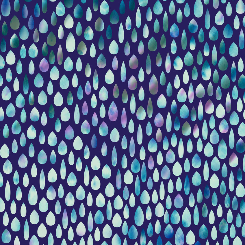 ST005 95% Cotton, 5% Elastane 60" W Jersey Water drops in blues and purple on a dark blue background. Soft hand, opaque and light weight. Tops, dresses, skirts.