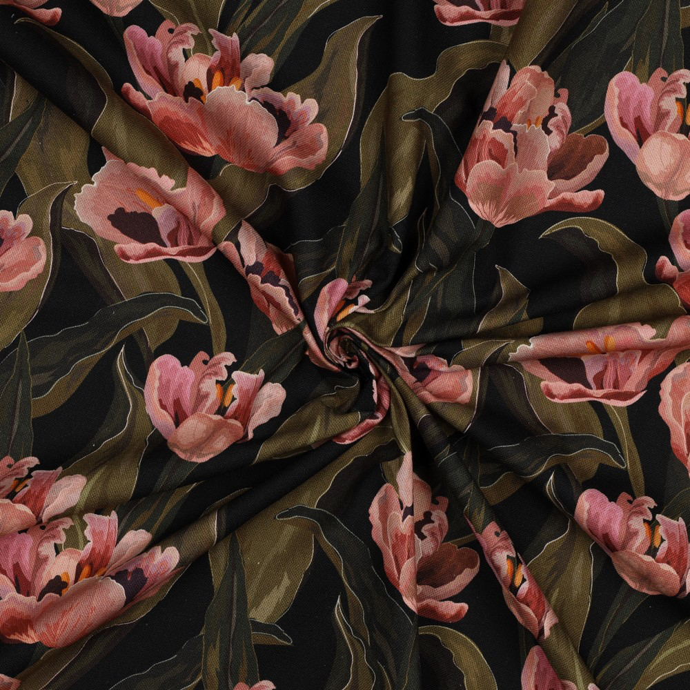 VT0308 100% Cotton 58" W Canvas Green, old rose, orange tulips digital print on black. Crisp hand, opaque. Light weight Tops, dresses, skirts, jackets, pillow covers